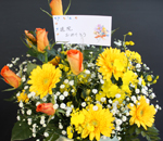 オレンジのバラ・黄色のガーベラ・カスミ草で仕上げておきました。