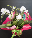 還暦と言うと赤いバラの花束がよく出ますが、今回は白の胡蝶蘭に赤のラッピングをしたものをお届けしました。