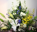 カサブランカよりも更に花の大きなノバセンブラというユリをメインに据え、脇をストック・オンシジウム・マリンブルー・デンファレで固めてみました。